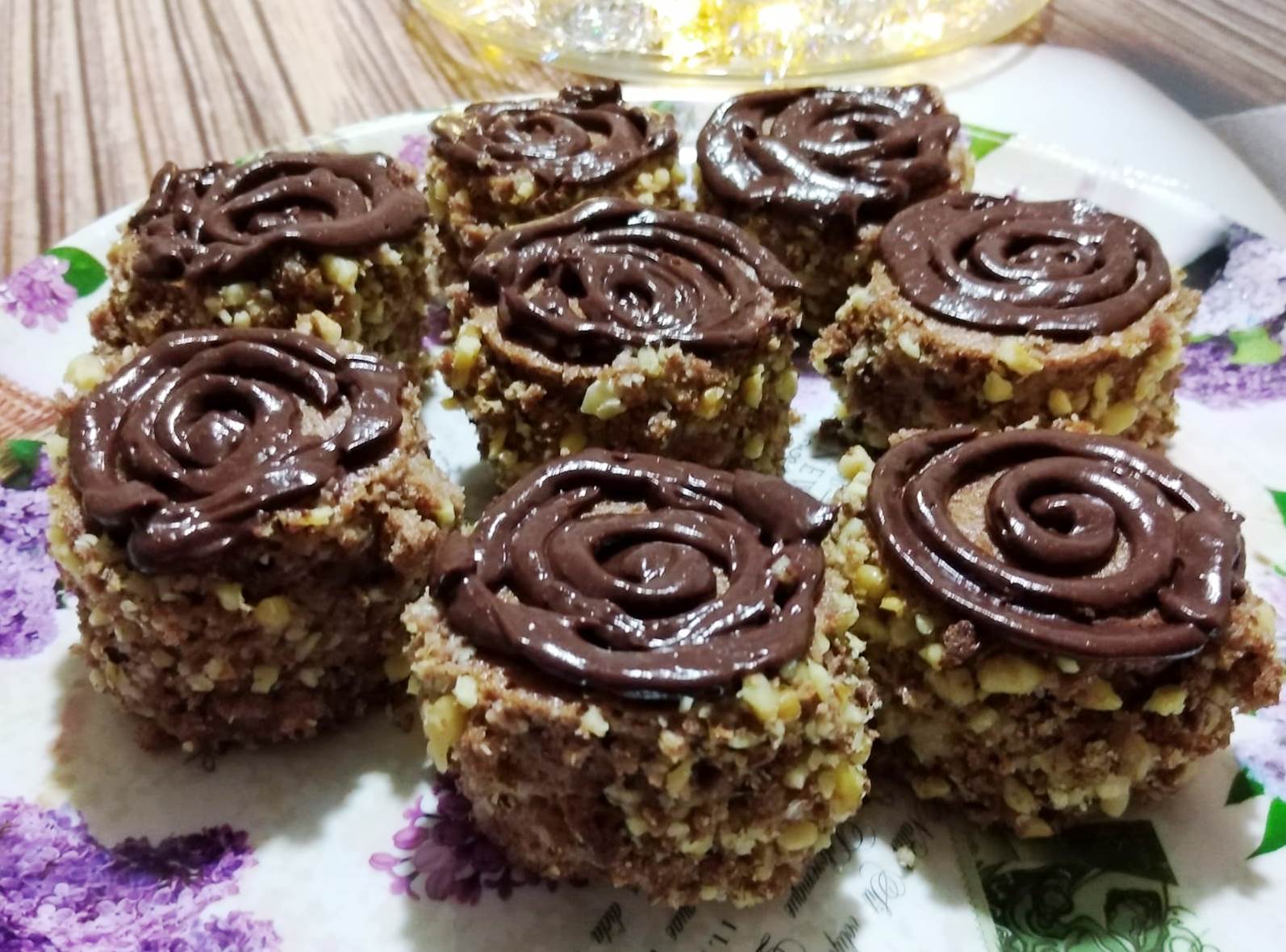 Παίρνετε έναν κύκλο από παντεσπάνι, βάζετε την κρέμα, βάζετε από πάνω έναν δεύτερο κύκλο. Τα παστακια αλείφονται στα πλαϊνά με κρέμα. Τυλίξτε τα με αλεσμένα καρύδια. Ρίξτε την κρέμα σοκολάτας από πάνω.