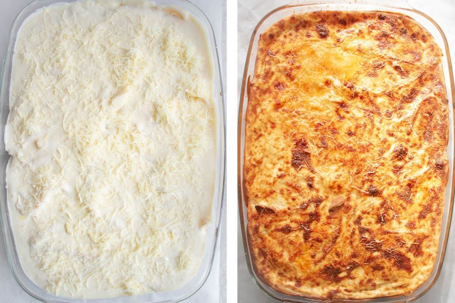 Προσθέστε την κρέμα ομοιόμορφα στο τέλος και προσθέστε μια γενναιόδωρη επικάλυψη τριμμένου τυριού στην κορυφή της κρέμας.