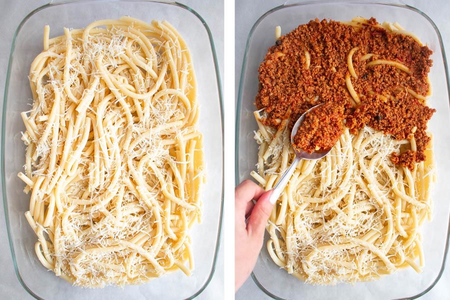 Απλώστε ομοιόμορφα τη σάλτσα κιμά στο επάνω μέρος (αν η σάλτσα σας δεν είναι αρκετά παχύρρευστη, χρησιμοποιήστε τρυπητή κουτάλα για να το κάνετε). Πασπαλίστε το υπόλοιπο τυρί (για τα ζυμαρικά) από πάνω.