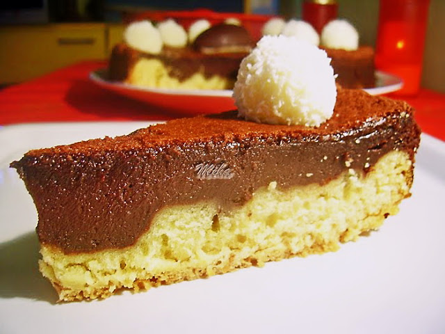 Σε αποσπώμενο ταψί (διαμέτρου 26 εκ.) στρωμένο με χαρτί ψησίματος απλώνουμε τη ζύμη του κέικ, σηκώνοντας λίγο στα τοιχώματα της φόρμας, σχηματίζοντας ένα περίγραμμα. Ρίχνουμε τη γέμιση και μετά βάζουμε στο φούρνο σε μέτρια φωτιά για 1 ώρα, μέχρι να αρχίσει να πήζει η γέμιση.