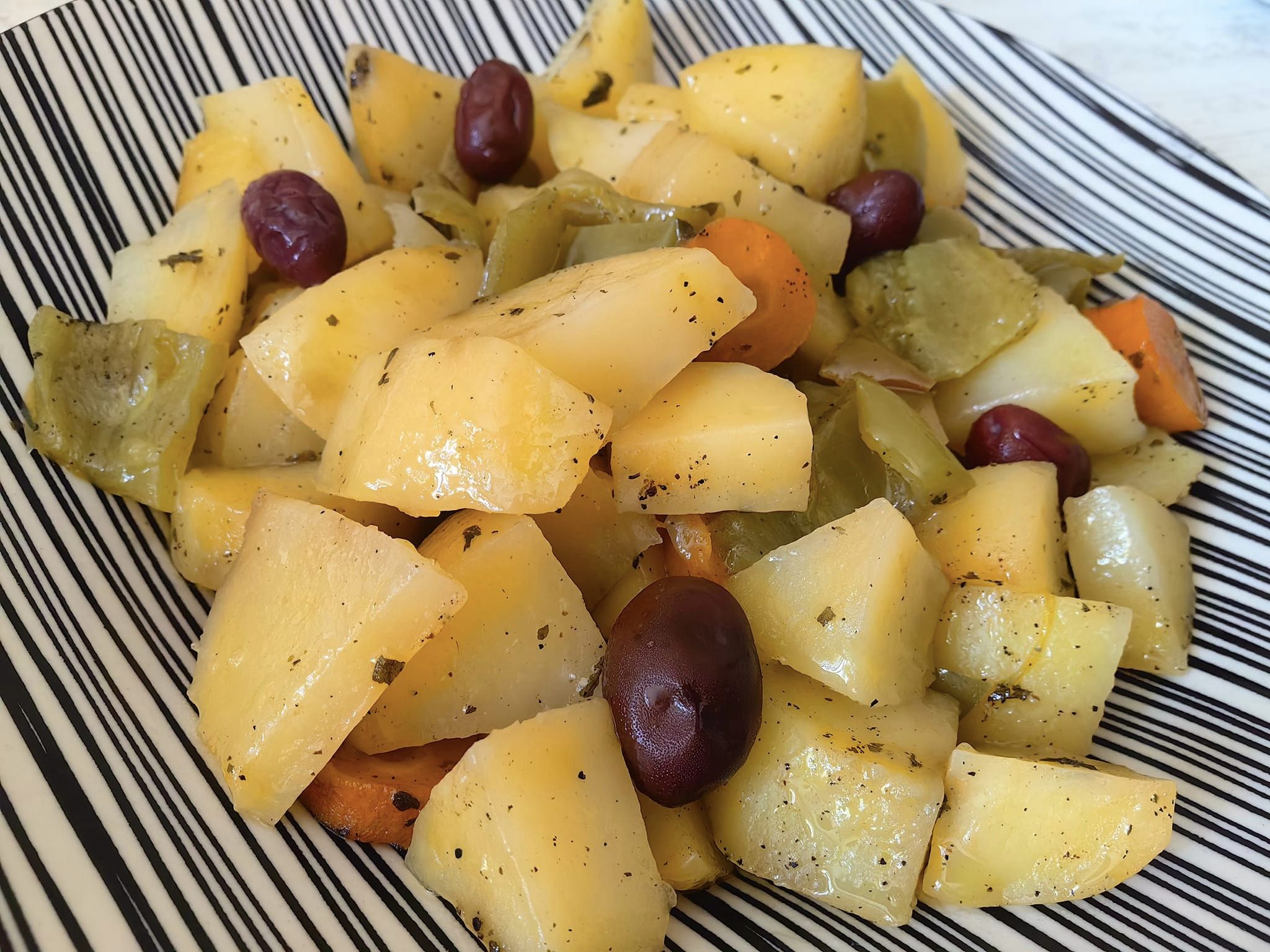 Ακολουθούν το καρότο και οι πιπεριές, το σκόρδο, η ρίγανη. Ρίχνουμε όσο ζεστό νερό χρειάζεται ώστε να καλυφθούν ακριβώς οι πατάτες ανακατεύετε τα πάντα για λίγα λεπτά και στη συνέχεια σκεπάζετε την κατσαρολα και σιγομαγειρεύουμε μέχρι να σωθούν τα υγρά για περίπου 30 λεπτά. Για να μαλακώσουν οι πατάτες. Περίπου 5’ πριν το τέλος του μαγειρέματος προσθέτουμε τις ελιές