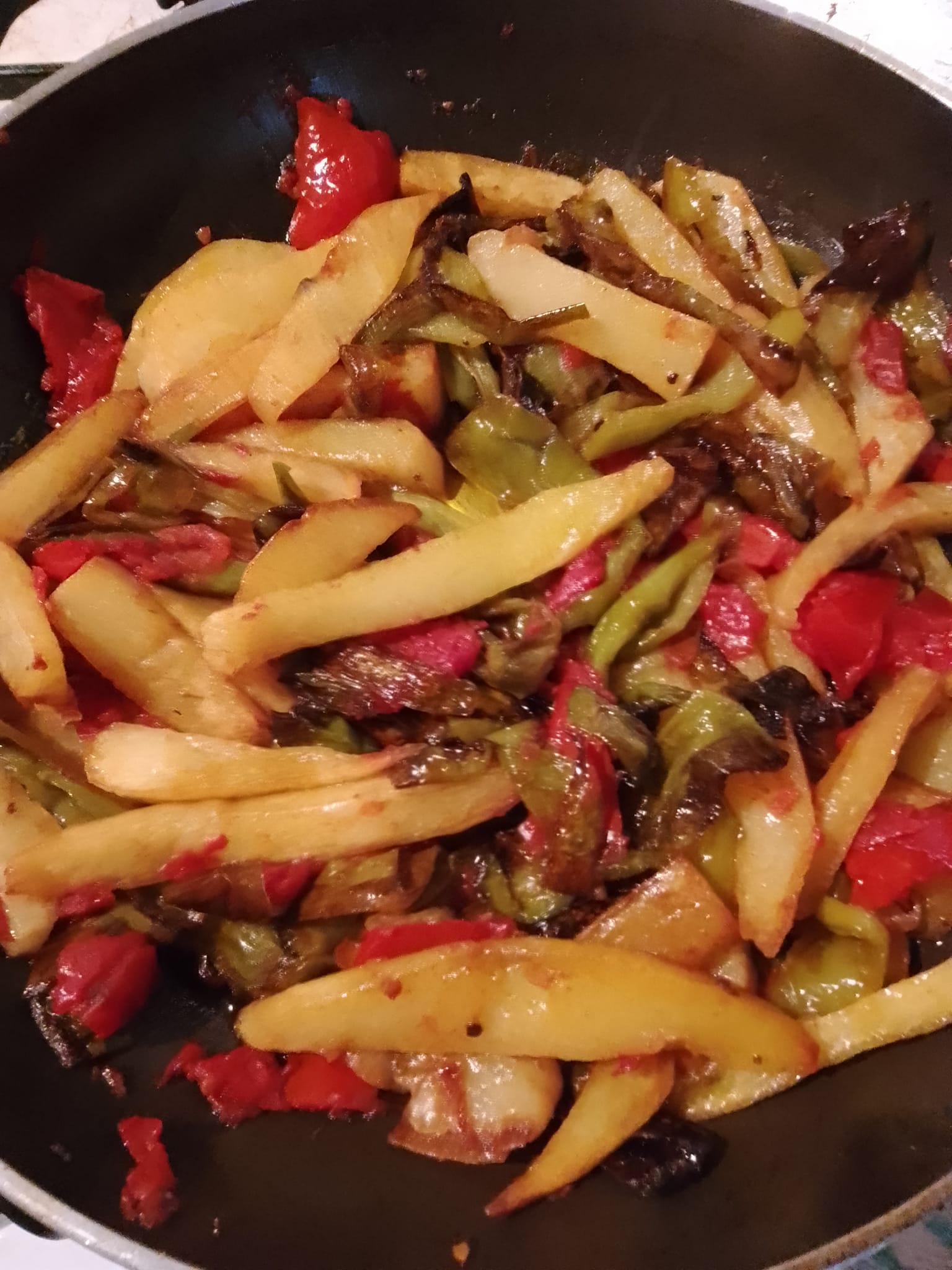 Πάρτε ένα μεγάλο τηγάνι και προσθέστε το έξτρα παρθένο ελαιόλαδο, το οποίο θα ζεστάνετε πριν προσθέσετε τις πατάτες και τις πιπεριές. Προσθέστε όλα τα υλικά και αλάτι.