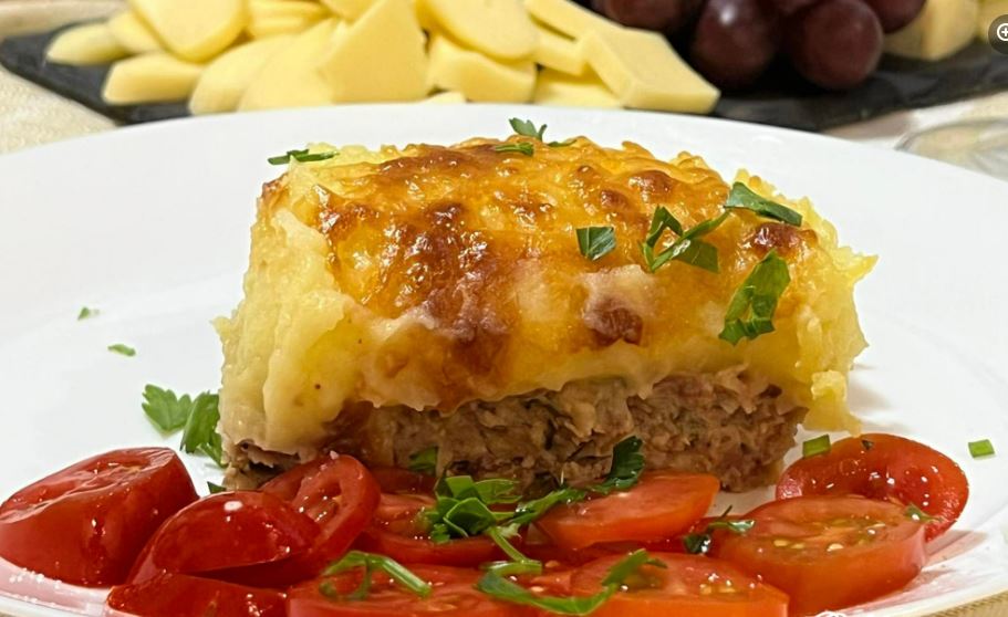 Η μεσαία στρώση είναι πουρές πατάτας (βραστές πατάτες πουρέ με λίγο γάλα και καρυκευμένες με αλάτι).