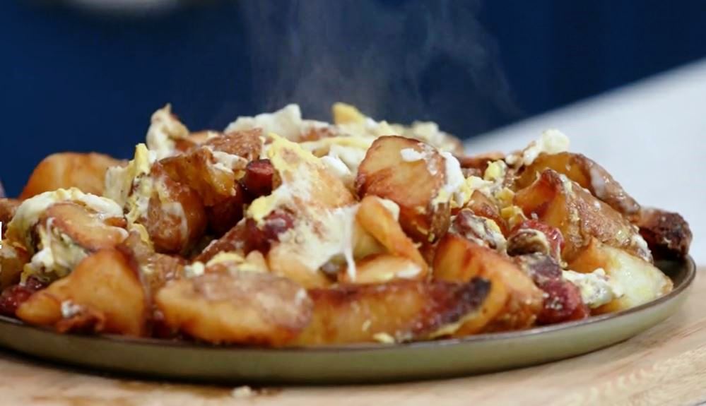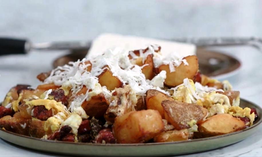 Μόλις είναι έτοιμες Τις πατάτες τις μεταφέρουμε στο τηγάνι με τα λουκάνικα, σπαμε τ αυγά στο τηγάνι πασπαλίζουμε με το αλάτι ανακατεύουμε και αποσύρουμε