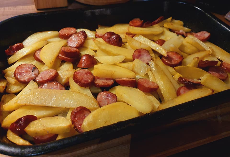 Έκοψα τις πατάτες τις έβαλα σε ένα ταψί και τις καρύκευσα με αλάτι, μαύρο, κόκκινο πιπέρι,πάπρικα 2 σκελίδες σκόρδο και λίγο λάδι.