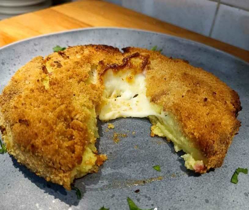 Πάρτε λίγο μείγμα και πλάθετε σε μια βάση κυκλική και τοποθετήστε μια φέτα προβολόνε στο κέντρο και στη συνέχεια καλύψτε με περισσότερο μείγμα και πιεστε.