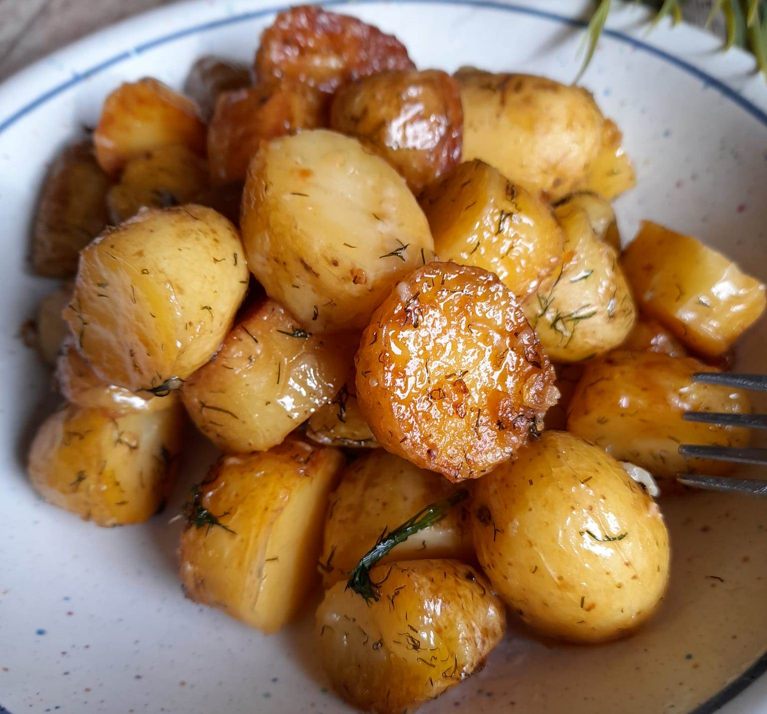 Όταν πάρουν χρώμα, τα βγάζετε από το φούρνο, τα βάζετε σε ένα ταψί, τα πασπαλίζετε με αλάτι άνηθο και μάραθο, ρίχνετε το βουτυρο, το λιωμένο σκόρδο και τα ανακατεύετε με μια κουταλα. Έτσι προετοιμασμένες, σας διαβεβαιώνω ότι γίνονται πραγματικά υπέροχες!