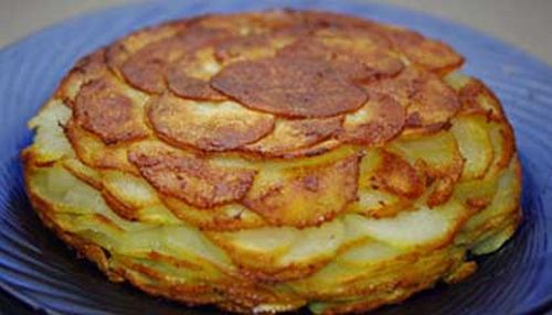 Ξεφλουδίστε τις πατάτες, κόψτε μερικές από αυτές σε φέτες πάχους 2 mm και βυθίστε τις σε κρύο αλατισμένο νερό για 10 λεπτά. Λιπάνετε το ταψί και ζεσταίνετε μέχρι να αρχίσει να καπνίζει το λάδι. Αφαιρέστε το ταψί από τη φωτιά και χρησιμοποιήστε ένα πιρούνι για να στρώσετε το κάτω μέρος και τα τοιχώματα του ταψιου με φέτες πατάτας που ειχα στο αλατισμένο νερό έτσι ώστε να ταιριάζουν μια πάνω στην άλλη, όπως τα λεπια του ψαριού. Κόψτε τις υπόλοιπες πατάτες σε λεπτούς κύκλους όχι περισσότερο από Πάχους 1 mm και τα τηγανίζουμε σε λάδι, στη συνέχεια τα απλώνουμε σε στρώσεις στο ταψακι, αλάτι, πιπέρι και αλειφουμε κάθε στρώση με λιωμένο βούτυρο. Καλύψτε το ταψί με καπάκι και βάλτε φωτιά για 15 λεπτά και στη συνέχεια στο φούρνο για 35-40 λεπτά. Σερβίρετε στο τραπέζι, αφαιρούμενο και αναποδογυρίζοντας την φόρμα, οι πατάτες μοιάζουν με χρυσή πίτα.