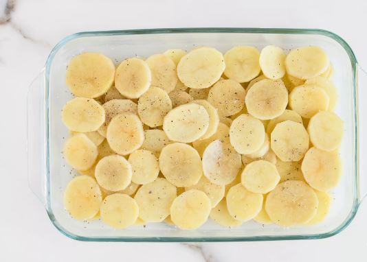 Στρώστε τις κομμένες πατάτες σε ένα πυρεξ 20×30 εκ και αλατοπιπερώστε