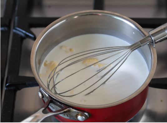 Συνδυάστε την κρέμα γάλακτος, το γάλα, τη μουστάρδα, το σκόρδο και το βούτυρο σε μια κατσαρόλα και θερμαίνετε ακριβώς μέχρι το σημείο βρασμού πάνω σε μεσαία υψηλή θερμοκρασία, ανακατεύοντας συχνά με σύρμα.