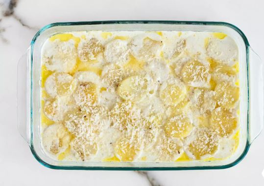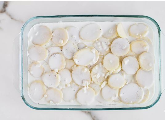 Ρίξτε το ζεστό μίγμα κρέμας πάνω από τις πατάτες.