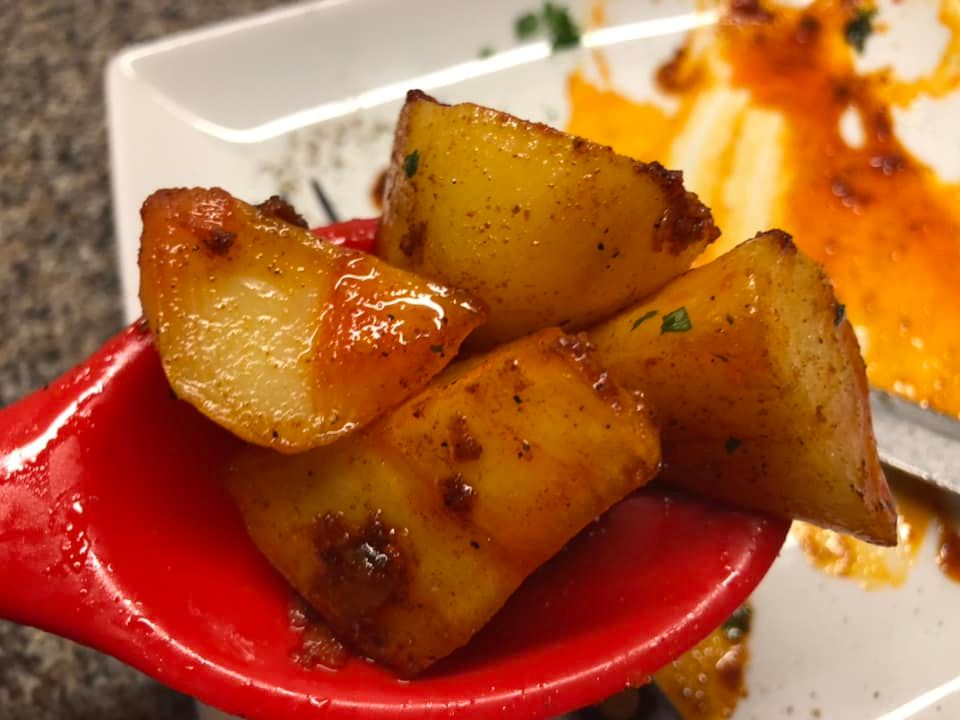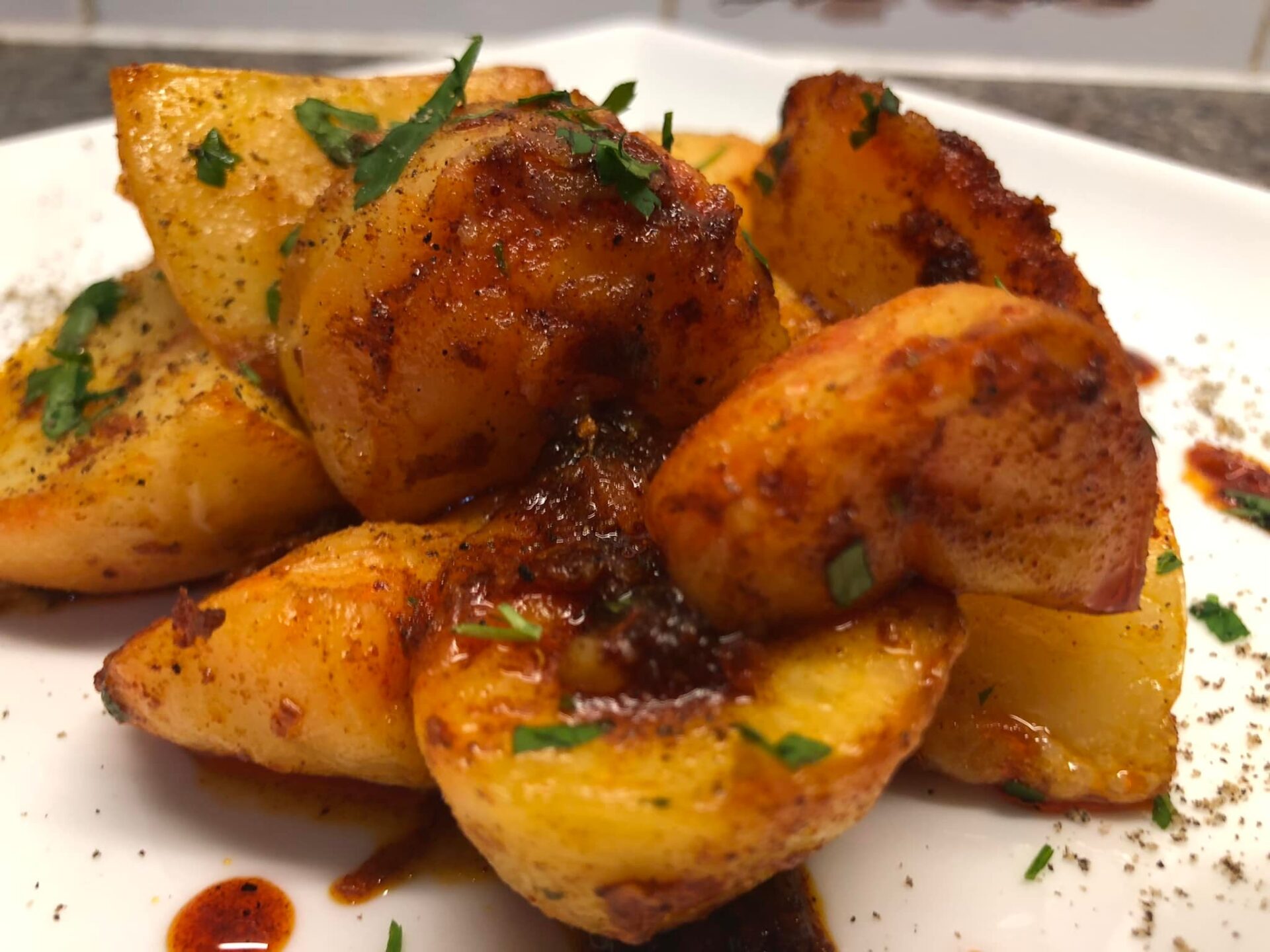 Βγάζετε τις πατάτες από το φούρνο και ρίχνετε τη σάλτσα απο πάνω ……ανακινείτε το ταψί για να βεβαιωθείτε ότι οι πατάτες έχουν καλυφθεί καλά……….πασπαλίζετε με ψιλοκομμένο μαϊντανό για να τις σερβίρετε.