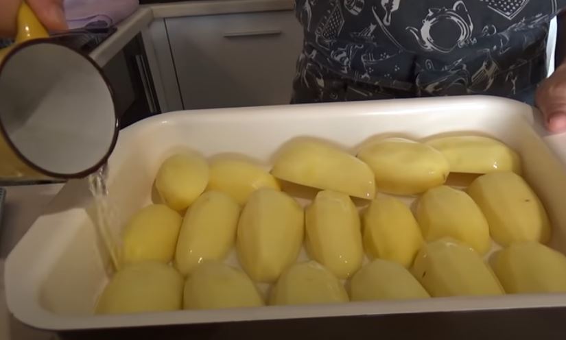 Ξεφλουδίστε τις πατάτες. Κόψτε τα στη μέση και τακτοποιήστε τα σφιχτά σε ένα ταψί. Συμπληρώστε με 200 ml. νερό.