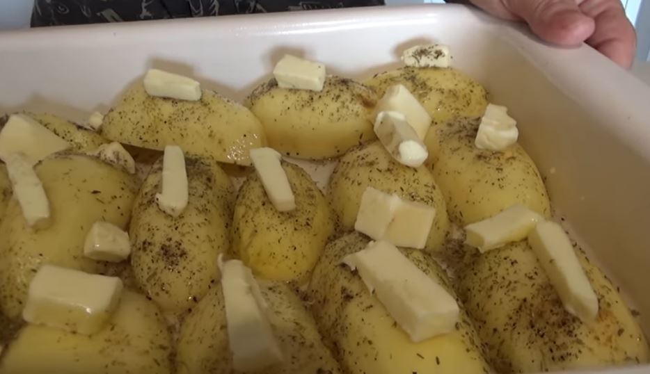 Καρυκεύστε με μαύρο πιπέρι, αλάτι, κύμινο και δενδρολίβανο. Απλώστε το βούτυρο στις πατάτες.