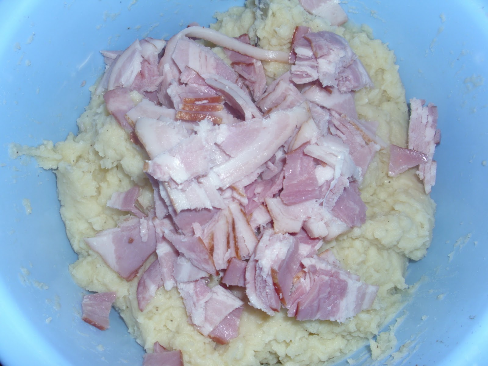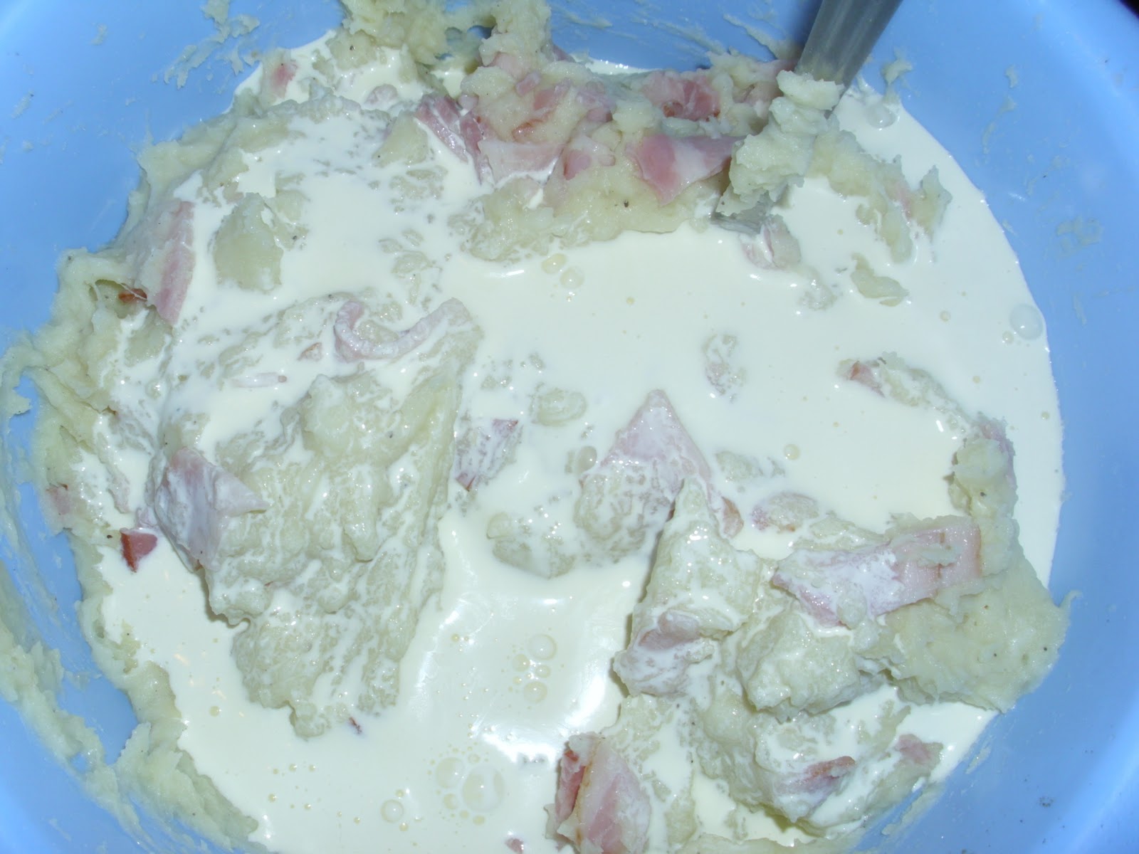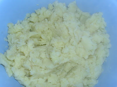 Αφού βράσουν οι πατάτες τις στραγγίζω από το νερό, τις βάζω σε μια λεκανίτσα και τις λιώνω με ένα πηρούνι. Βάζω το βούτυρο και ανακατεύω πολύ καλά να λιώσει μέσα στις πατάτες όπως είναι ζεστές.