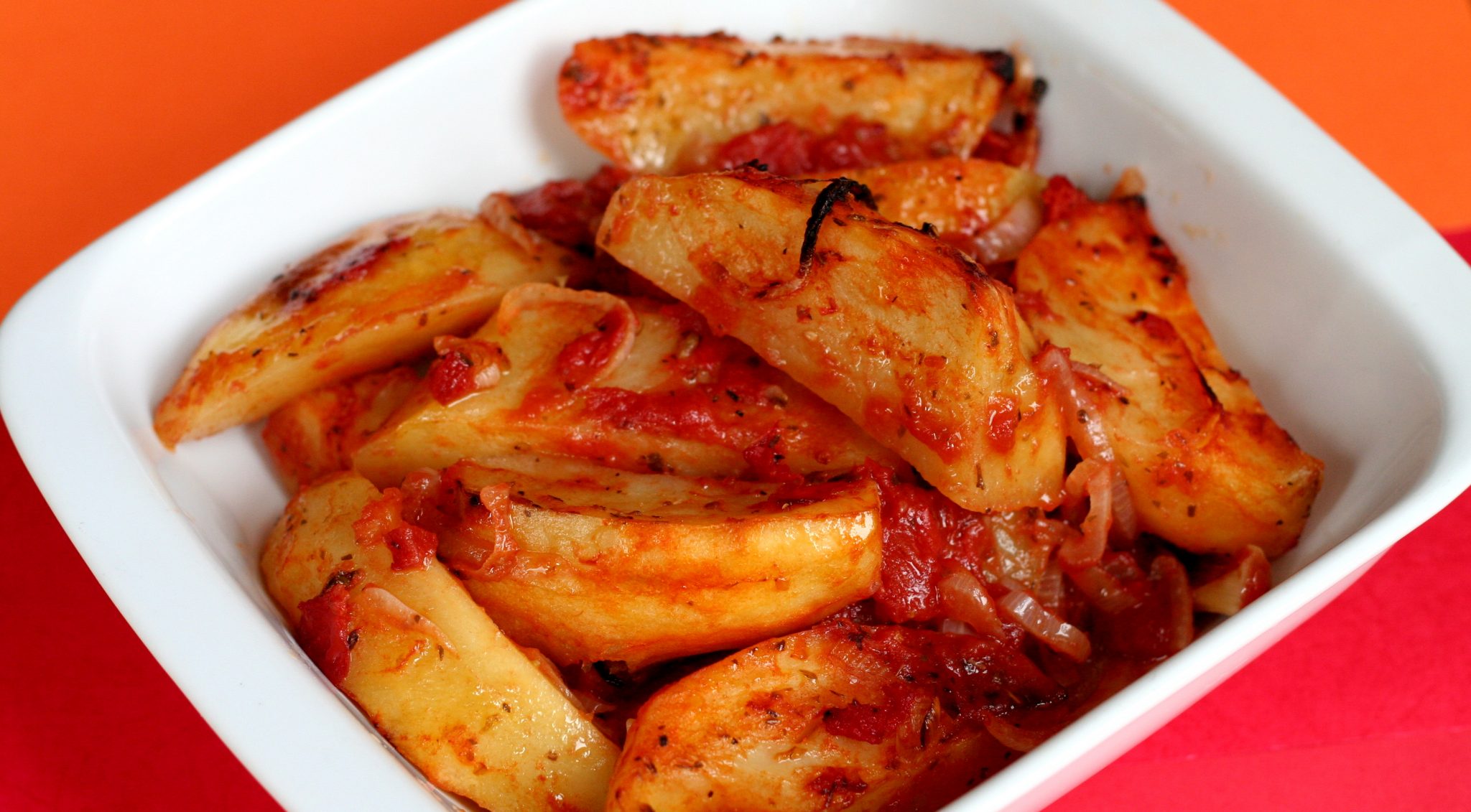 Τοποθετήστε τις πατάτες σας σε ένα βαθύ ταψί που είναι αρκετά μεγάλο για να χωρέσει όλες τις πατάτες. Προσθέτουμε το ελαιόλαδο, το σκόρδο, τις ντομάτες, το κρεμμύδι την πάπρικα, το αλάτι και το πιπέρι και ανακατεύουμε με τα χέρια καλά. Προσθέστε αρκετό ζεστό νερό για να καλύψετε μόνο τις πατάτες και δοκιμάστε και προσαρμόστε το αλάτι.