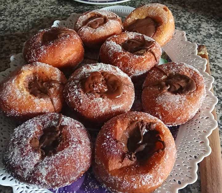 Τα ντόνατς με πατάτα Nutella είναι έτοιμα για σερβίρισμα στο τραπέζι, τακτοποιημένα σε ανάχωμα, σε πιατέλα σερβιρίσματος.