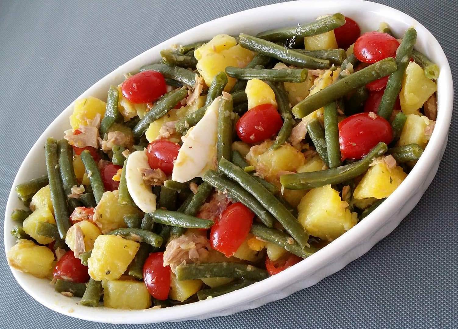 Σε ένα μεγάλο μπολ, βάζουμε τα φασολάκια (κομμένα στη μέση αν είναι μεγάλα), τις πατάτες, τις ντομάτες, τον τόνο (στραγγισμένο από το λάδι), την ψιλοκομμένη πιπεριά τσίλι (αν χρησιμοποιούμε), τα αυγά (κομμένα σε πολλά μέρη), τη ρίγανη και το αλάτι.