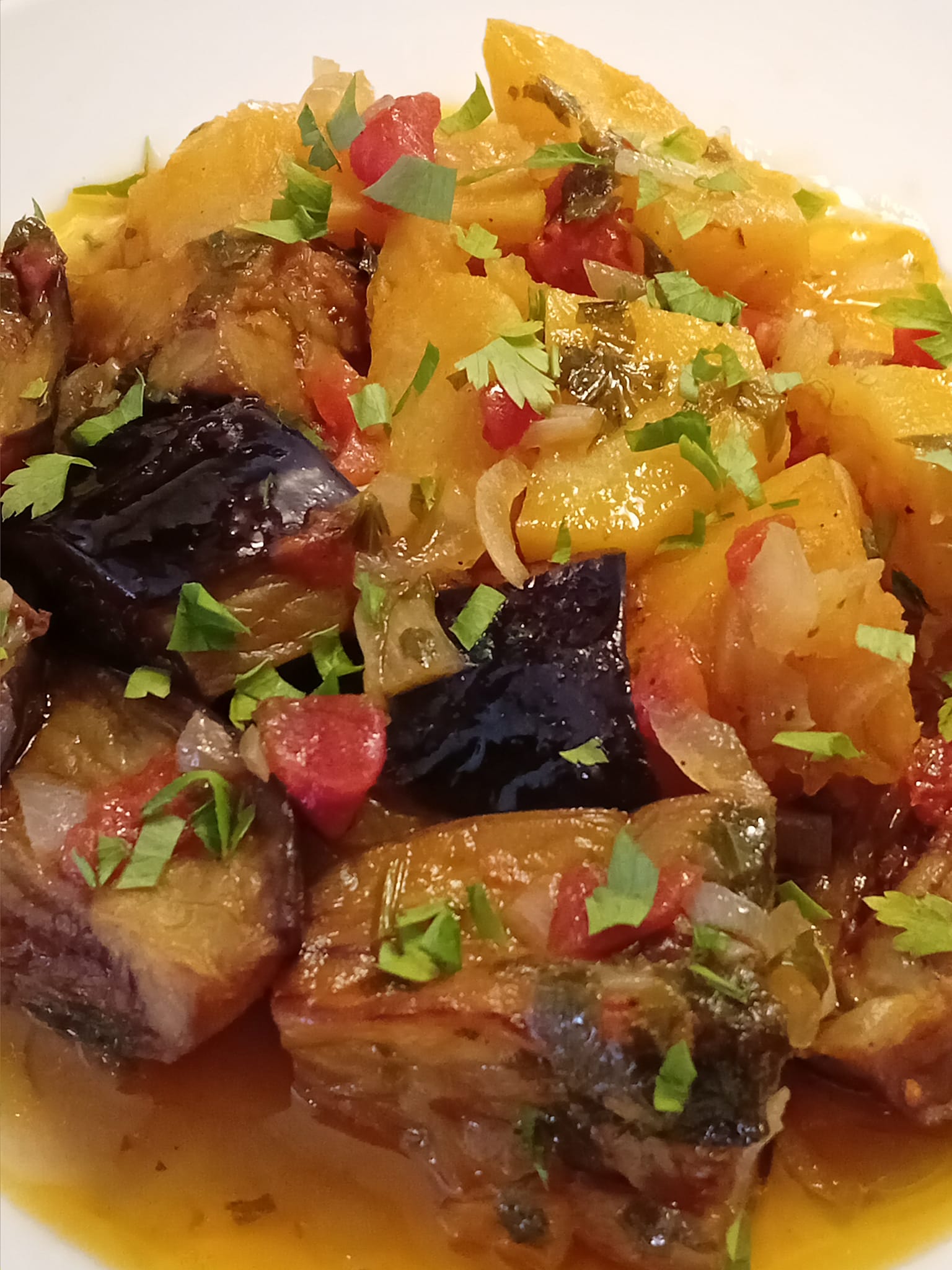 Προσθέτετε τις πατάτες και τις μελιτζάνες. Ανακατεύετε απαλά για να μην σπάσουν. Σκεπάζετε την κατσαρόλα και χαμηλώνετε τη φωτιά. Σιγοβράζετε για 20-25 λεπτά, μέχρι να μαλακώσουν οι πατάτες και οι μελιτζάνες.