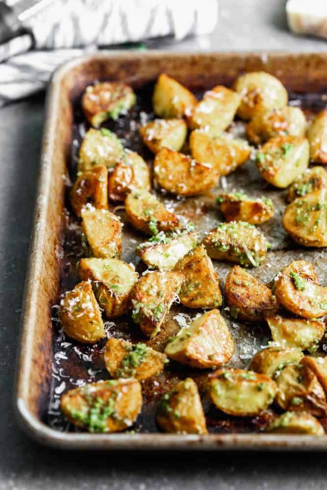 Προσθέστε τις πατάτες σε ένα μεγάλο μπολ. Ρίξτε από πάνω ελαιόλαδο και ανακατέψτε με τα χέρια. Πασπαλίστε με 1/2 κουταλάκι του γλυκού αλάτι. Ανακατέψτε πάλι. Απλώστε τες σε ένα μεγάλο φύλλο ψησίματος. Ψήνουμε για 20 λεπτά. Χρησιμοποιήστε μια σπάτουλα για να γυρίσετε τις πατάτες πάνω, και ψήστε άλλα 8-10 λεπτά μέχρι γίνουνε τραγανές και χρυσαφένιες.