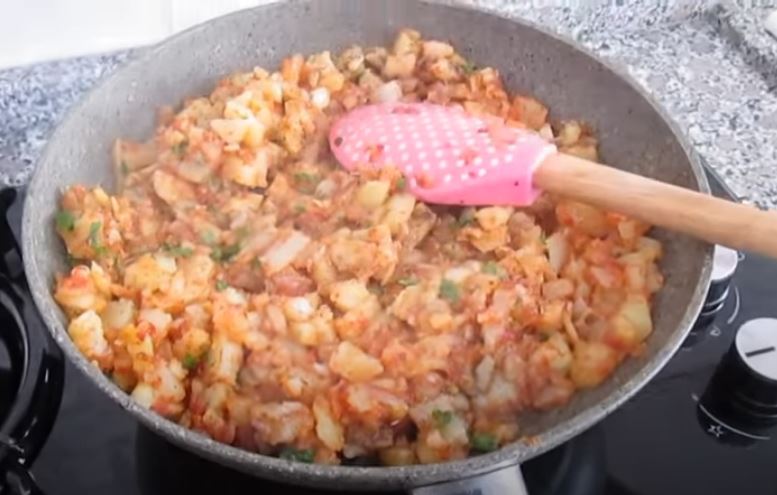 Προσθέτουμε τον πελτέ στο τηγάνι και ανακατεύουμε για λίγο και ρίχνουμε και όλες τις πατάτες και μαγειρεύουμε για λίγο και ρίχνουμε και όλα τα μπαχαρικά αλάτι και μαϊντανό και ανακατεύουμε έτσι ώστε οι πατάτες να έχουν μαλακώσει τότε σβήνουμε την φωτιά και αφήνουμε στην άκρη.