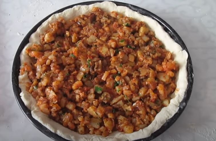 Γεμίζουμε με το μείγμα του τηγανιού και σκεπάζουμε με την υπόλοιπη ζύμη.
