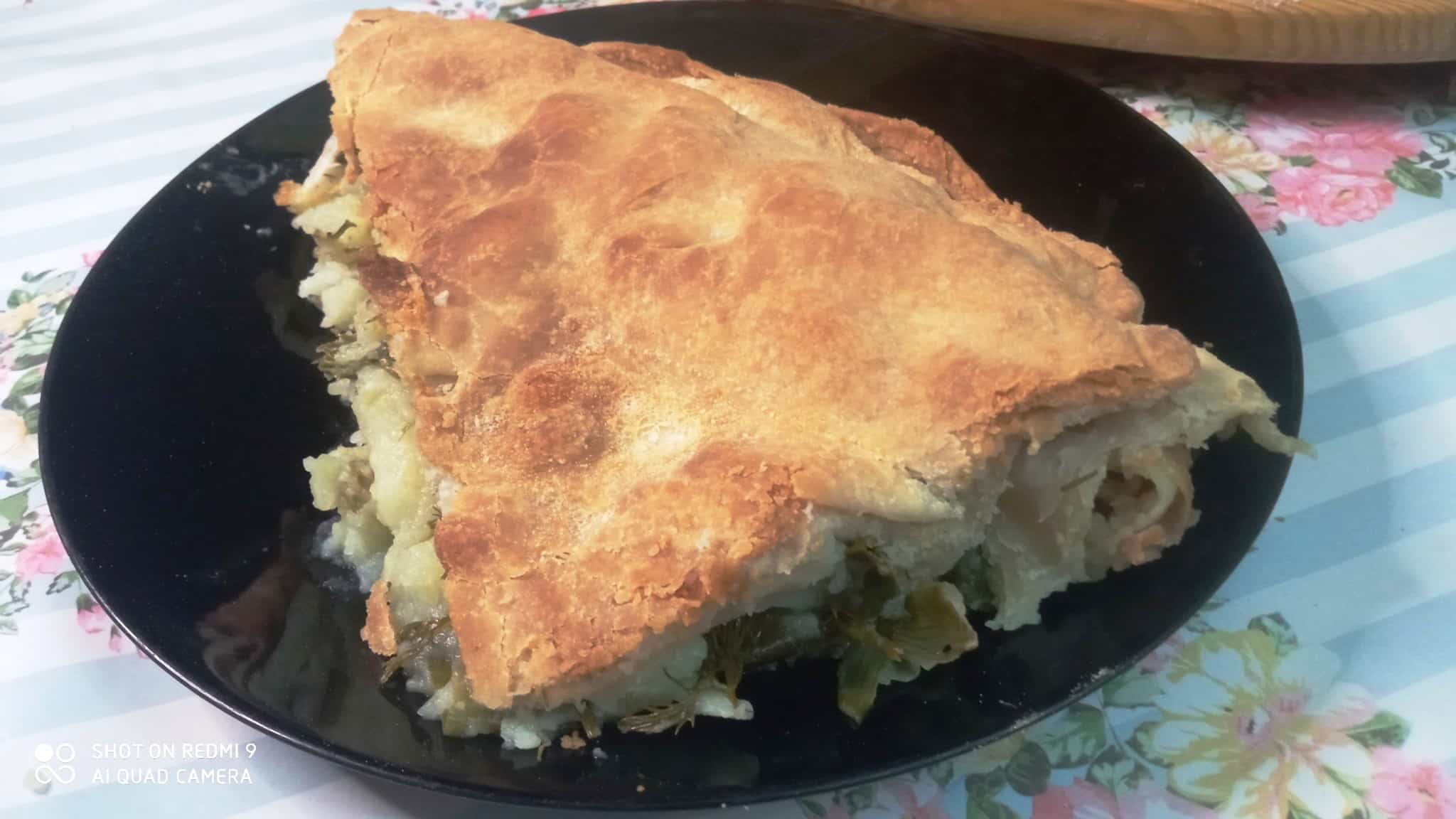 Προσθέστε τη γέμιση από πάνω, απλώνοντάς την ομοιόμορφα και διπλώνουμε προς τα μεσα τα φυλλα που κρέμονται εξω απο το ταψι.