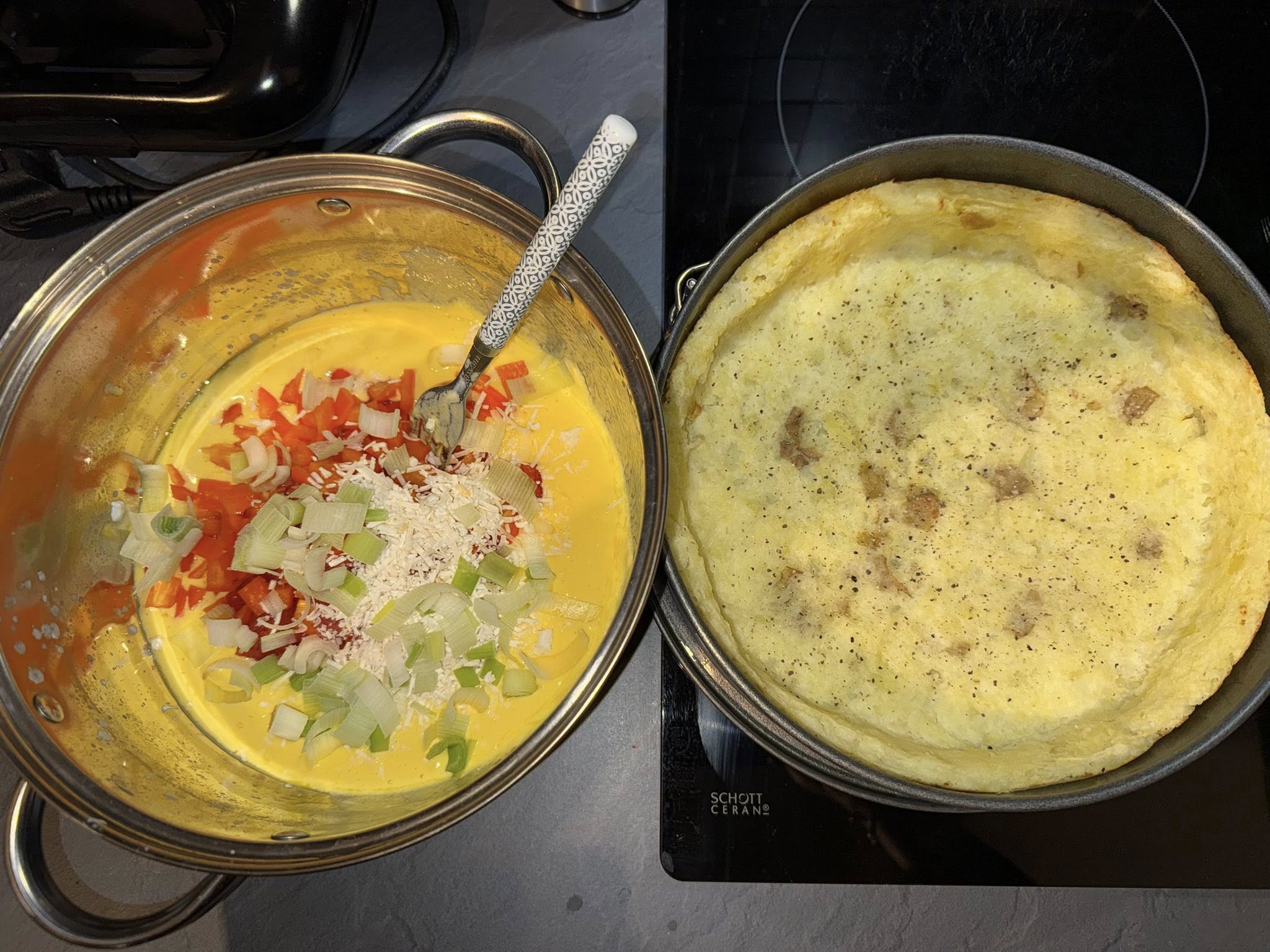 Αφαιρούμε τη φωλιά από το φούρνο, ρίχνουμε μέσα το μείγμα αυγών, ψήνουμε σε προθερμασμένο φούρνο στους 180 βαθμούς για 40 λεπτά καιιιιιιι.. απολαμβάνουμε