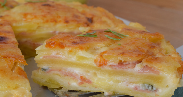 6 Ψήνετε τη πατατόπιτα σε προθερμασμένο στους 170 βαθμούς φούρνο για 45-50 λ ή μέχρι όταν ελέγξετε τις πατάτες με ένα πιρούνι αυτές να έχουν μαλακώσει καλά και ροδοκοκκινίσει η επιφάνειά του.