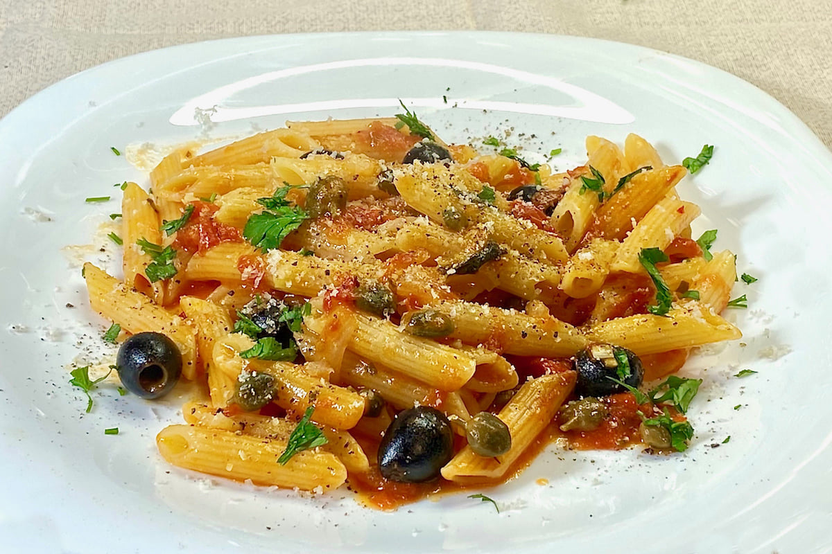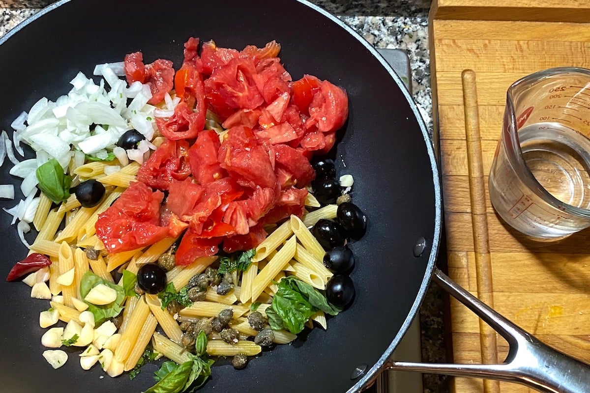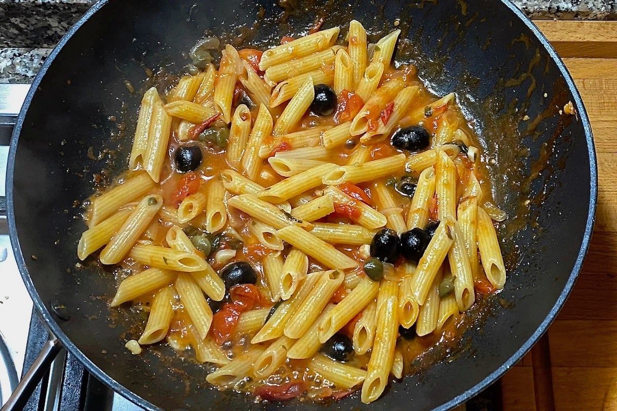 Σήμερα τις πένες μας τις μαγειρεύουμε λίγο ασυνήθιστα: όλα τα υλικά τοποθετούνται μαζί στο τηγάνι και στη συνέχεια μαγειρεύονται με λίγο -λίγο προστιθέμενο νερό. Η γεύση είναι πιο έντονη, χάρη στο ότι το άμυλο ζυμαρικών παραμένει στο τελικό πιάτο με την σάλτσα αντί να διασκορπιστεί σε βραστό νερό.