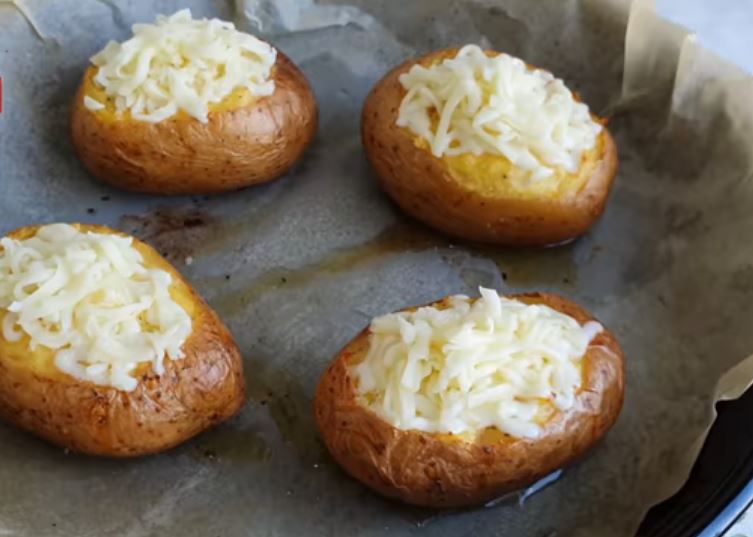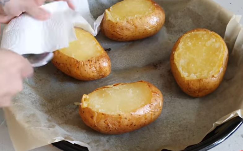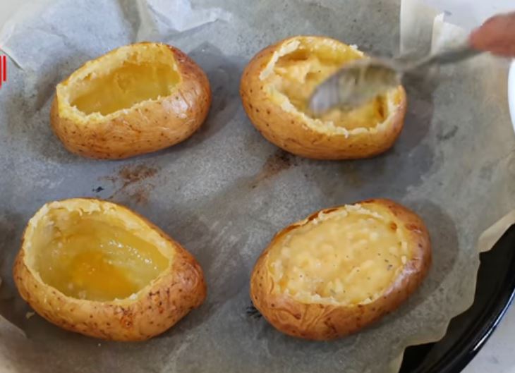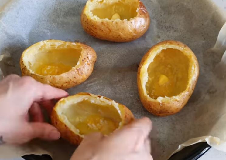 Κόβετε ένα λεπτό στρώμα από πάνω και αδειάζουμε με ένα κουτάλι του γλυκού τις πατάτες εσωτερικά και βάζουμε όλο το εσωτερικό της πατάτας σε ένα μπολ.