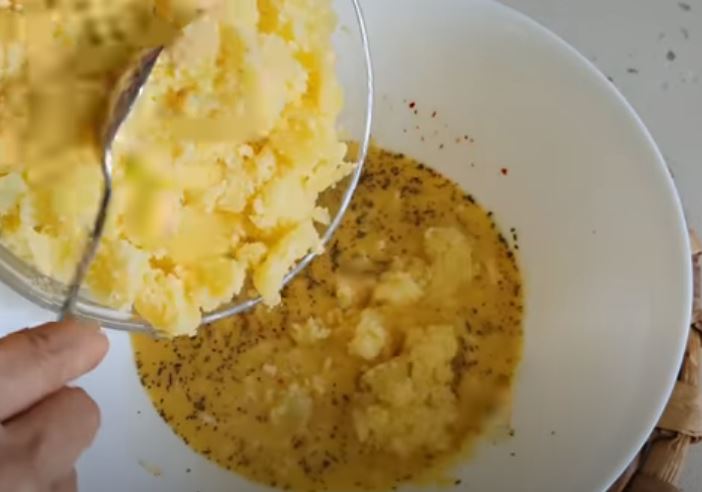 Αδειάζουμε μέσα στο υγρό μείγμα σταδιακά τις πατάτες απο το μπολ