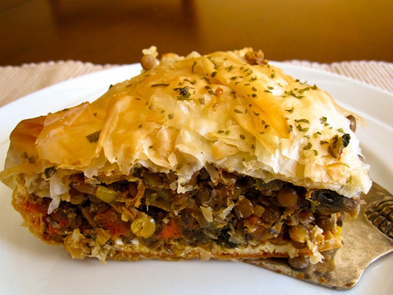 Στρώνετε το 1/3 των φύλλων στον πάτο ενός βουτυρωμένου ταψιού, το άλλο 1/3 στα πλάγια, βουτυρώνετε διαδοχικά τα φύλλα και γεμίζετε με τη γέμιση.