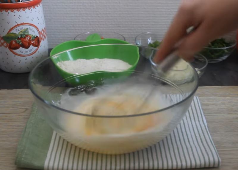 Ρίχνουμε σ΄ενα μεγάλο μπολ τ αυγά, το λάδι, το γάλα και τα χτυπάμε με το σύρμα.