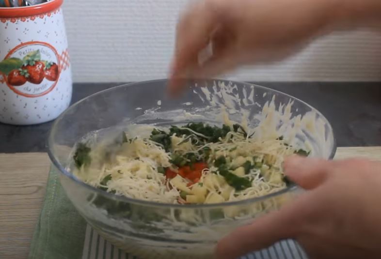 Ρίχνουμε και το μπέικιν. Προσθέτουμε το κρεμμύδι, τις πιπεριές, τις πατάτες,το τυρί και τέλος τον μαϊντανό. Αλατοπιπερώνουμε.