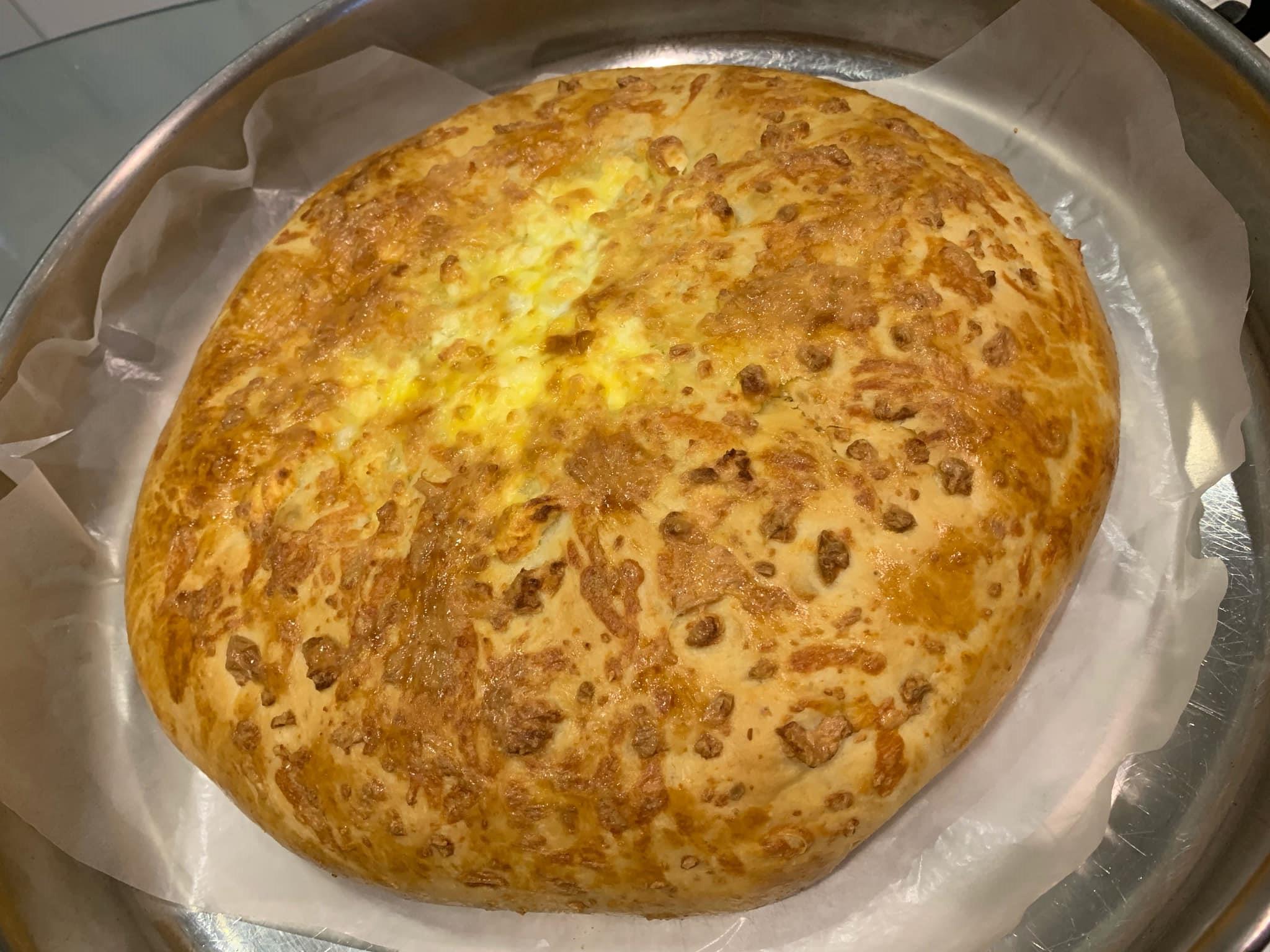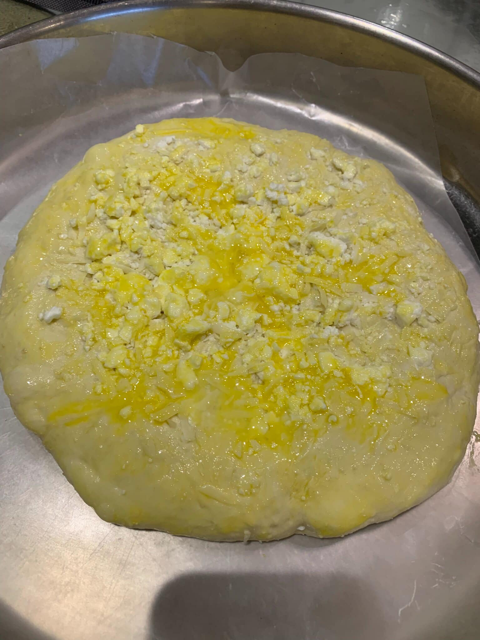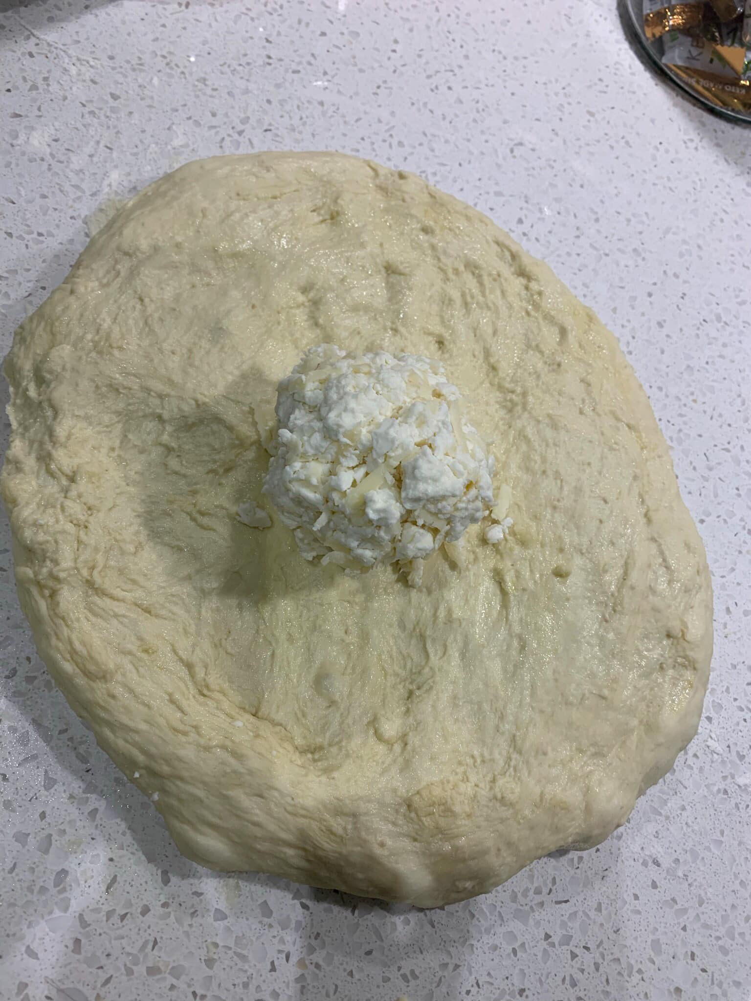 Έβαλα όλα τα υγρά υλικά στο πολυμίξερ Και σιγά-σιγά πρόσθεσα το αλεύρι με τη μαγιά που είχα ανακατέψει. Ζυμώνω για 10 λεπτά Την σκεπάζουμε και την αφήνουμε για μισή ώρα να ξεκουραστεί. Την τοποθετούμε σε αλευρωμένη επιφάνια. Αναμειγνύουμε την μισή φέτα με Την κεφαλογραβιέρα.