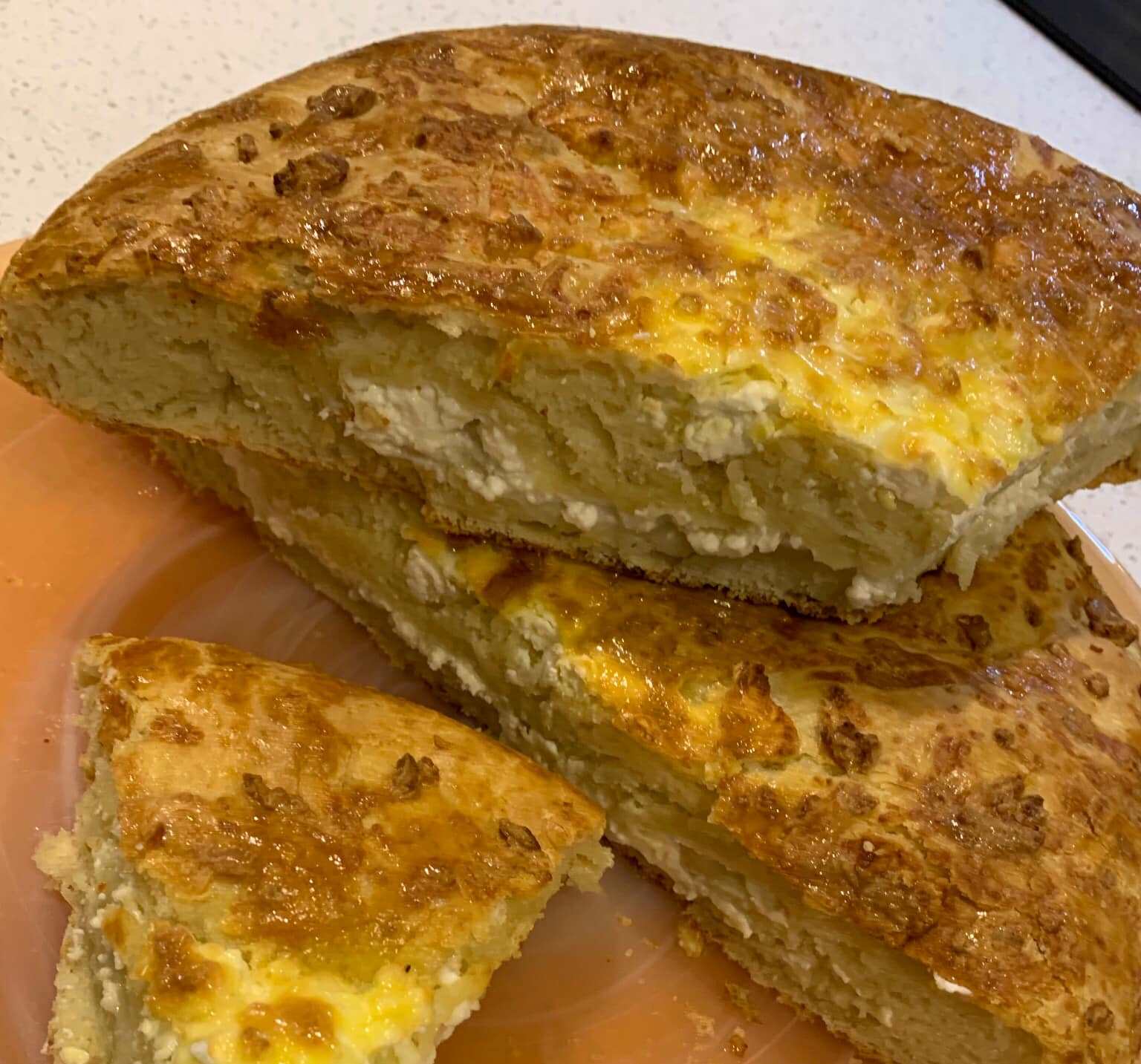 Έβαλα όλα τα υγρά υλικά στο πολυμίξερ Και σιγά-σιγά πρόσθεσα το αλεύρι με τη μαγιά που είχα ανακατέψει. Ζυμώνω για 10 λεπτά Την σκεπάζουμε και την αφήνουμε για μισή ώρα να ξεκουραστεί. Την τοποθετούμε σε αλευρωμένη επιφάνια. Αναμειγνύουμε την μισή φέτα με Την κεφαλογραβιέρα.