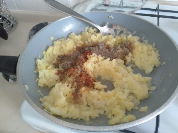 Ανακατέψτε τα καρυκεύματα. Χρησιμοποιήστε ένα πηρούνι για να λιώσετε πλήρως τις Πατάτες ενώ μαγειρεύετε. Όταν όλα είναι καλά αναμεμειγμένα σβήστε τη φωτιά. Αφήστε στην άκρη για να κρυώσει.
