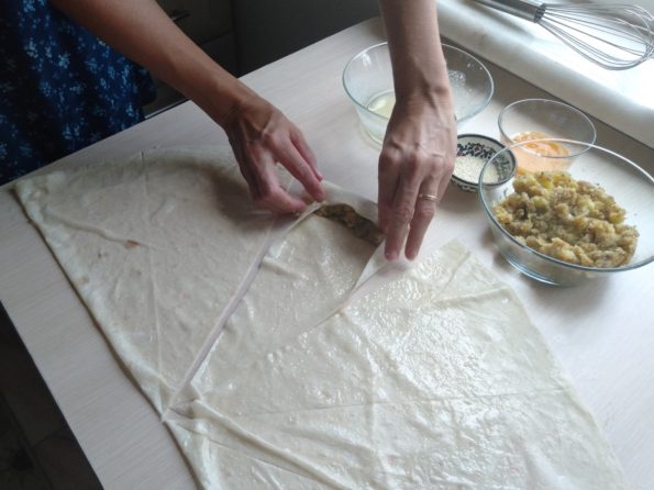 Τοποθετήστε ένα μικρό κομμάτι μείγματος Πατάτας στην άκρη του κάθε τριγώνου