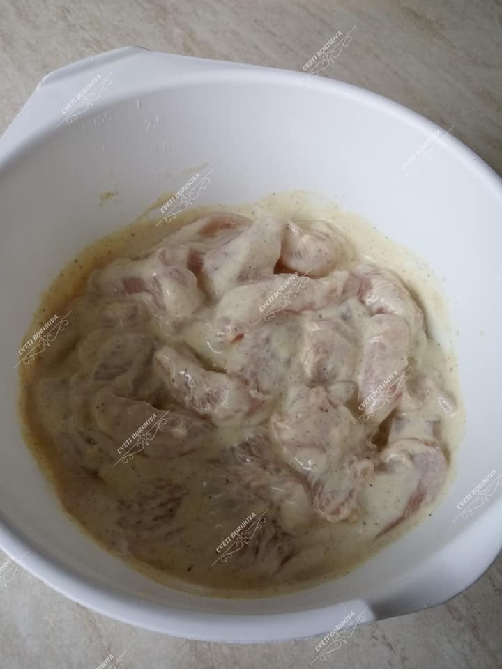 Κόβουμε το φιλέτο σε κομμάτια. Το αλατίζουμε και το πασπαλίζουμε με μαύρο πιπέρι. Προσθέτουμε το γιαούρτι και τη μουστάρδα. Ανακατεύουμε καλά και αφήνουμε στο ψυγείο για μια ώρα.