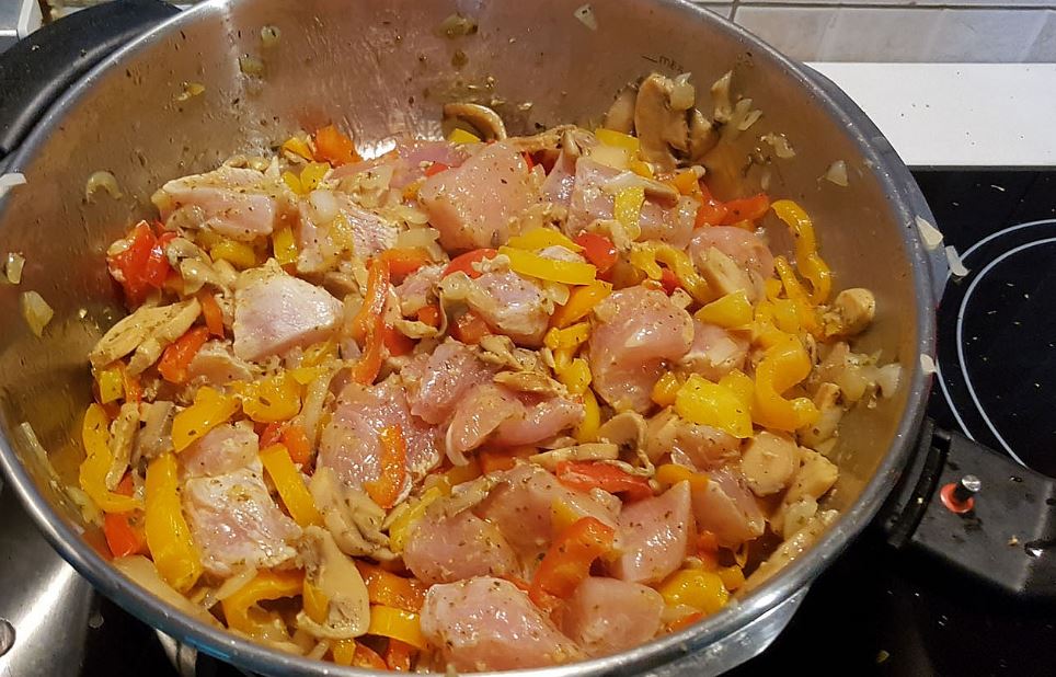 Ήρθε η ώρα να ρίξουμε τα κομματάκια κοτόπουλου! Τα βάζουμε και συνεχίζουμε το τσιγαρίσμα μέχρι να ασπρίσει το κοτόπουλο.