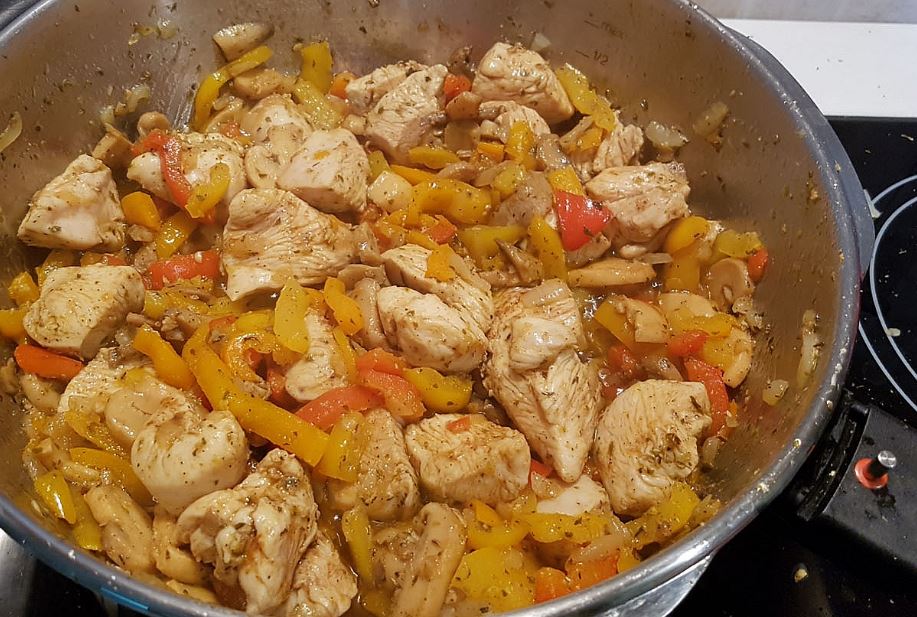 Πρώτα κόβουμε τις πιπεριές, το κρεμμύδι, τα μανιτάρια(αν δεν είναι κονσέρβα) και τις πιπεριές σε κομματάκια.
