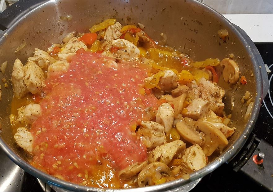 Όταν γίνει αυτό, τότε προσθέτουμε νερό, τον πελτέ ντομάτας(ή τριμμένη φρέσκια ντομάτα), τα μπαχαρικά, ένα κύβο λαχανικών και τα βράζουμε για περίπου 40 λεπτά.