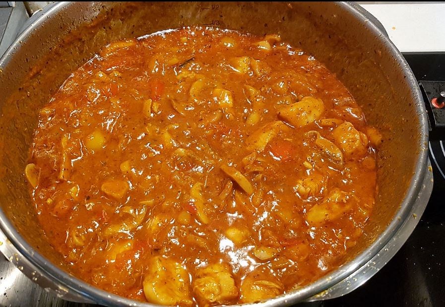 Στα 20 λεπτά, δοκιμάζουμε, εάν η σάλτσα είναι γευστική και εάν το κοτόπουλο έχει βράσει και αναλόγως προσθέτουμε ή όχι μπαχαρικά και νερό.