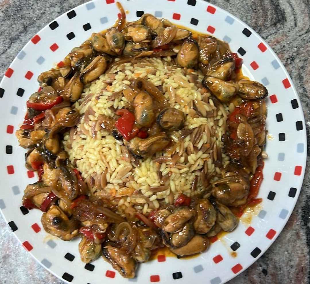 Περνώ το μεγάλο και βαθύ τηγάνι και το βράζω στη φωτιά ρίχνω το λάδι και το κρεμμύδι το αλάτι και την ζάχαρη και το να κατέβουμε για 5 λεπτά ρίχνουμε το σκόρδο και την σάλτσα ντομάτας δικό μου ρίχνουμε και την πιπεριά φλορινης τα μπαχαρικά και τα μύδια τα να κατέβουμε λίγο και μετά ρίχνουμε το νερό ζεστό όμως! Περιμένουμε να δέσει η σάλτσα το δοκίμασουμε και μετά κλείνουμε την φωτιά!
