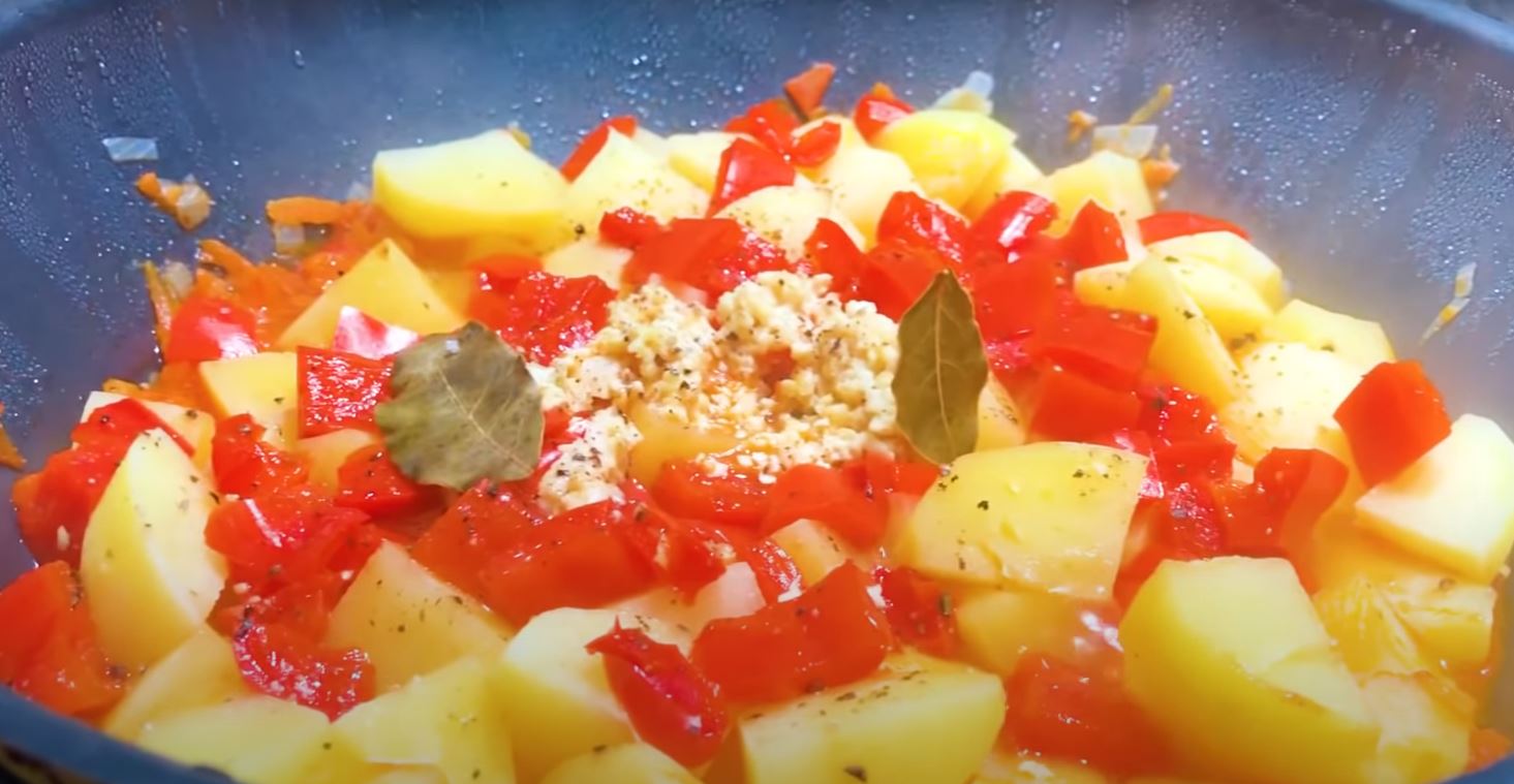 Ρίχνω το σκόρδο , πιπέρι , δαφνόφυλα , αλάτι και σκεπάζω να βράσουν μέχρι οι πατάτες