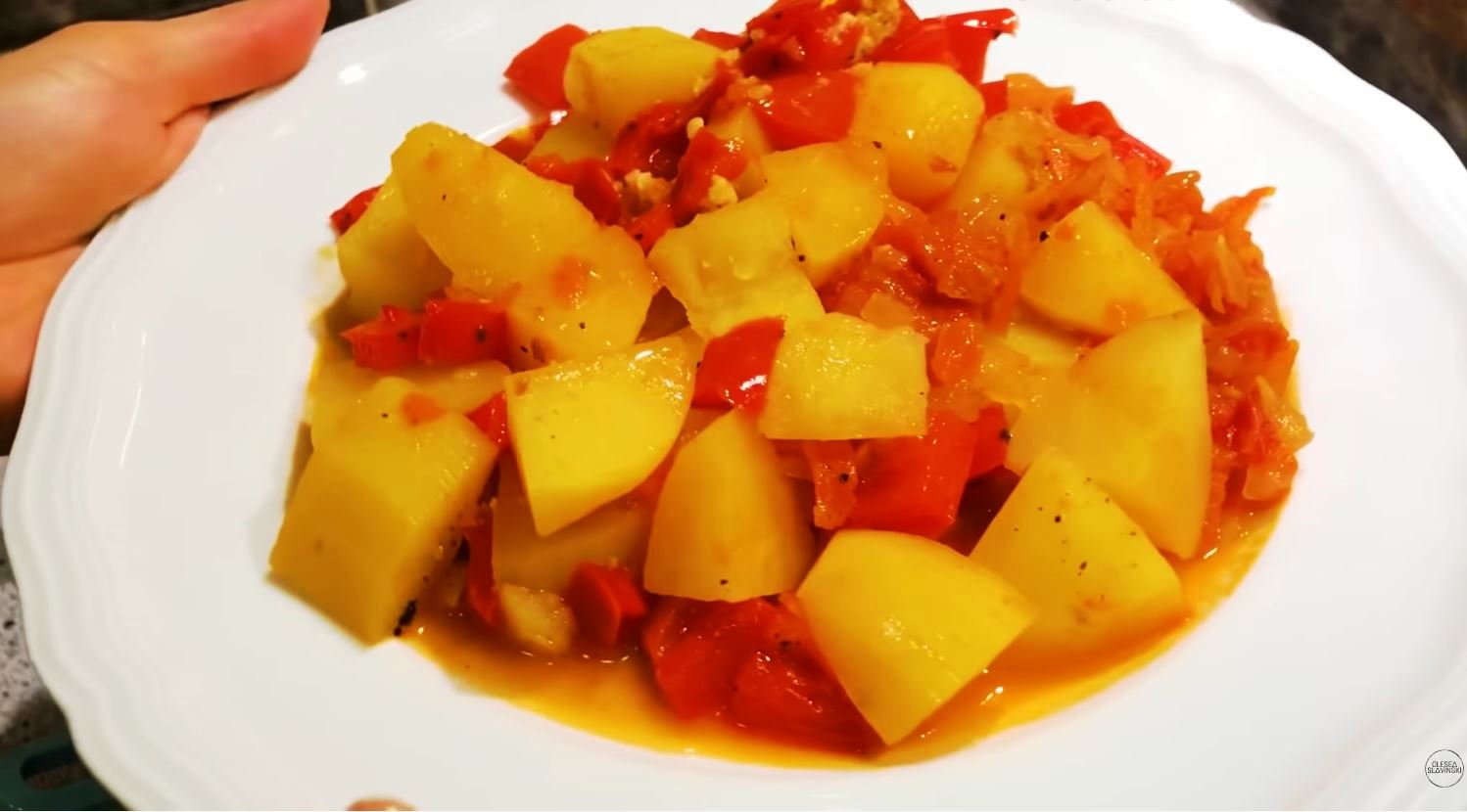 Προσθέτω τις πατάτες στο τηγάνι και ψιλοκόβω την πιπεριά και την ρίχνω και αυτήν.