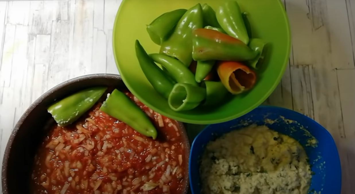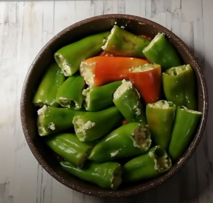 Παίρνουμε κάθε μία πιπεριά και γεμίζουμε με το μείγμα αυγού και την βάζουμε στο ταψάκι