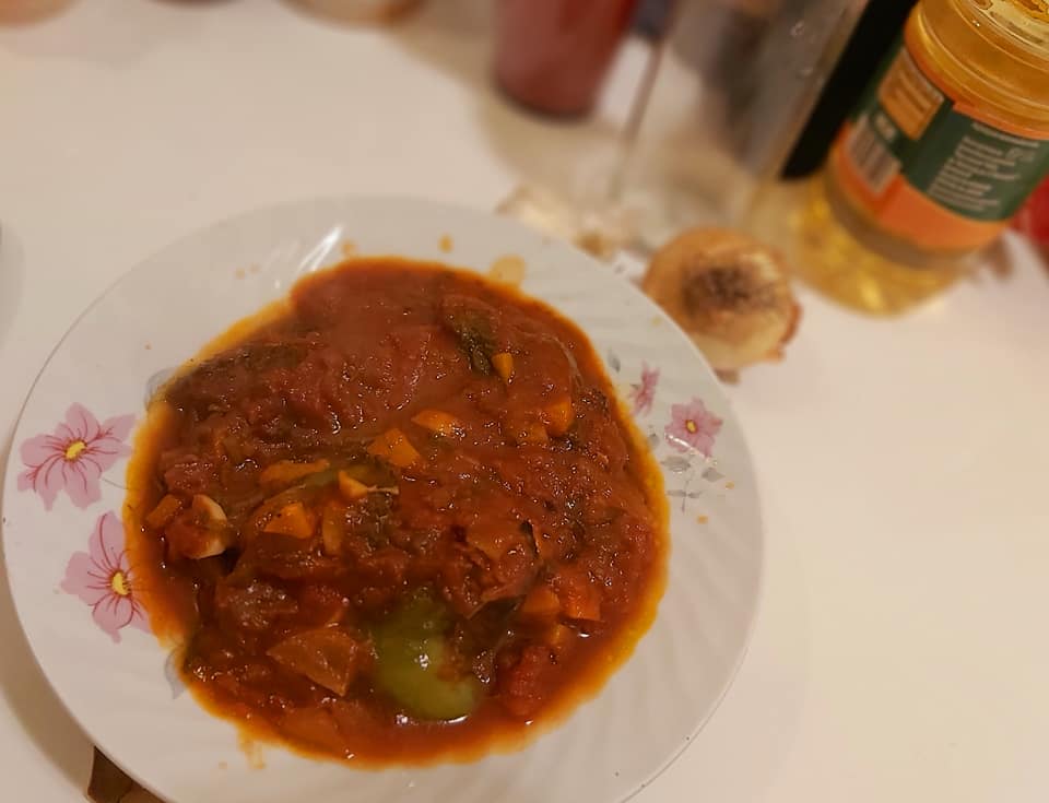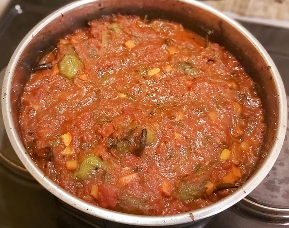 Έψησα και ξεφλούδισα τις πιπεριές. Τις τηγάνισα σε λάδι. Στο ίδιο λάδι σοτάραμε το κρεμμύδι ψιλοκομμενο με το καρότο τριμμένο. Στη συνέχεια πρόσθεσα τις ντομάτες και μερικές σκελίδες σκόρδο.