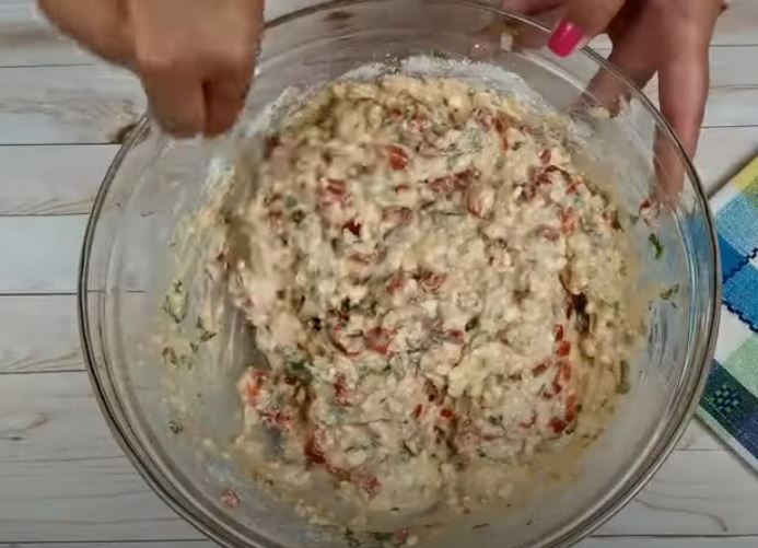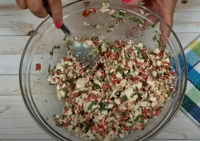 Σε ένα μπολ αναμιγνύουμε τις πιπεριές το κρεμμύδι το μαϊντανό, το σκόρδο, την φέτα